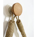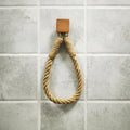 Suporte de toalha/papel higiênico para banheiro. Feito em juta e madeira, possui um design rústico.